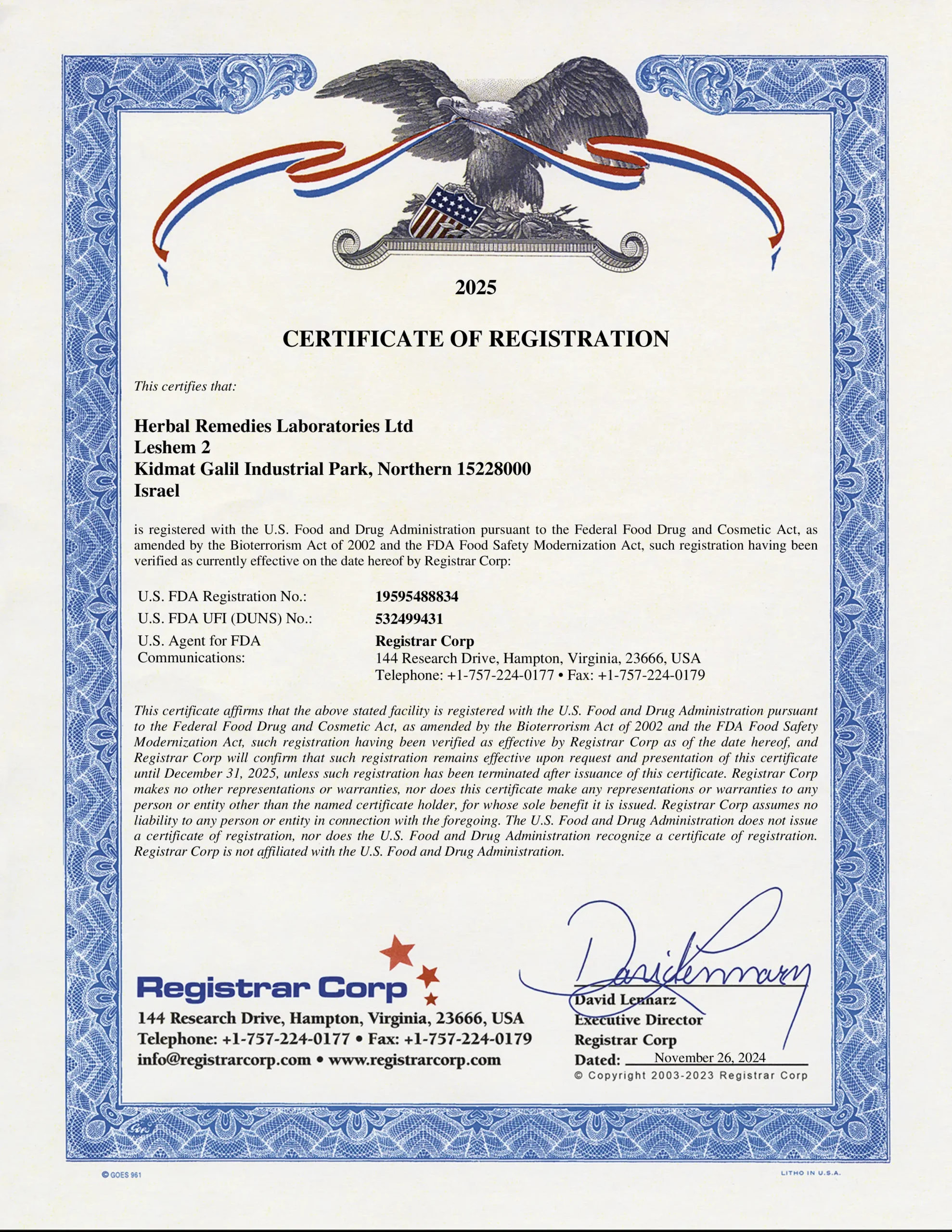 • ייצור במפעל רשום ומפוקח ע״י ה-FDA (למתקני הייצור)